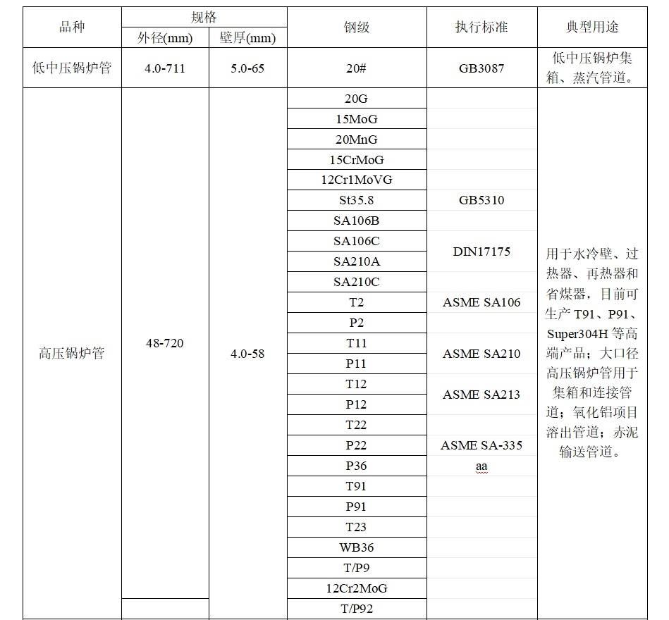 执行GB/T3087、GB/T5310、DIN17175、EN10216、ASME SA-106、ASME SA-192、ASME SA -210M、ASME SA -213M、ASME SA -335M等相关标准。用于高压锅炉(工作压力一般在9.8Mpa以上,工作温度在450℃~650℃之间)的受热面管子、省煤器、过热器、再热器、石化 工业用管等。